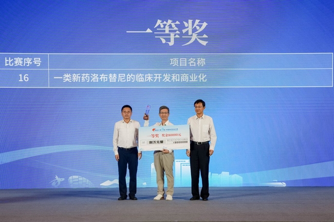 科技部國際人才交流中心副主任秦濤(圖右),蘇州高新區黨工委副書記、虎丘區區長吳琦(圖左)為獲得一等獎的廣州麓鵬制藥團隊代表頒獎